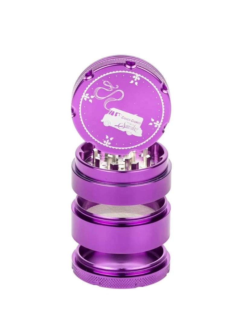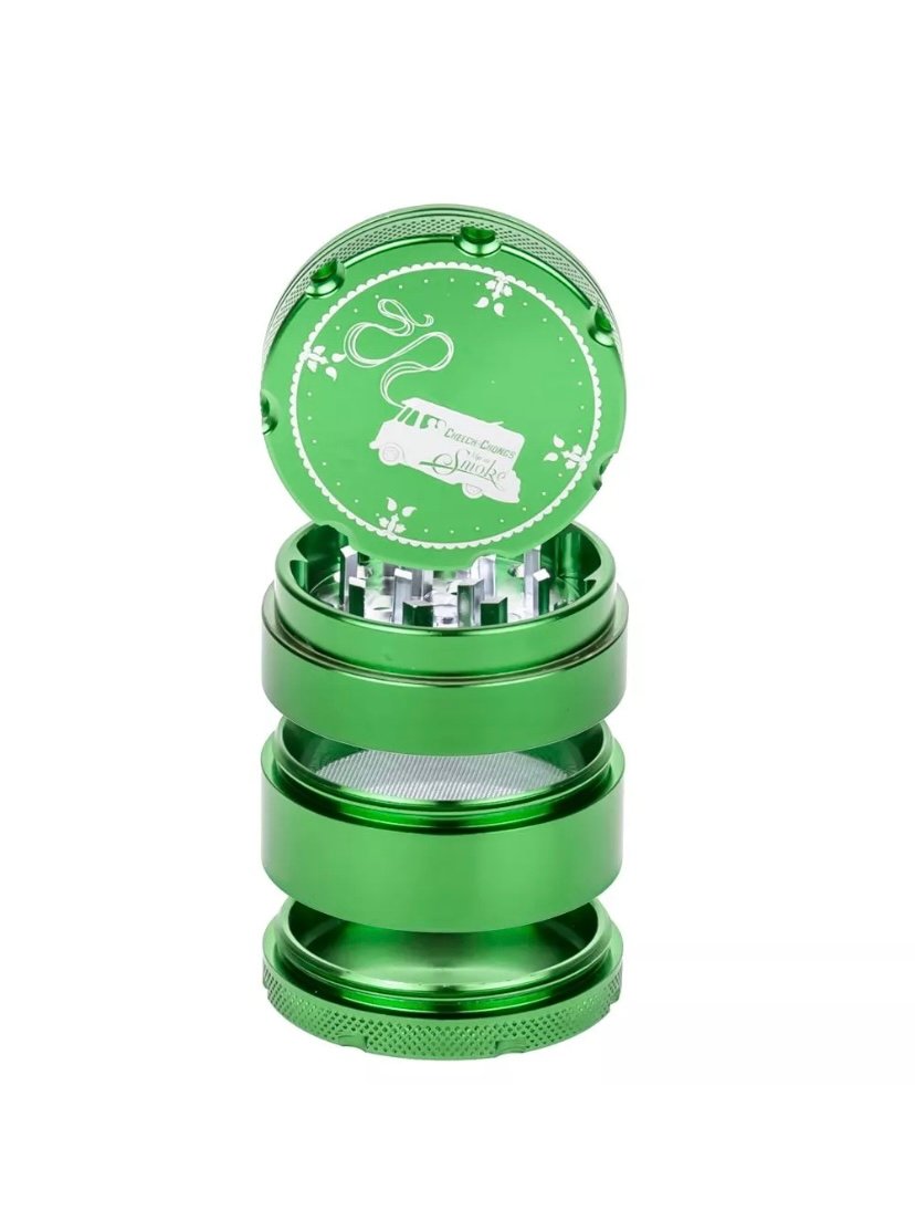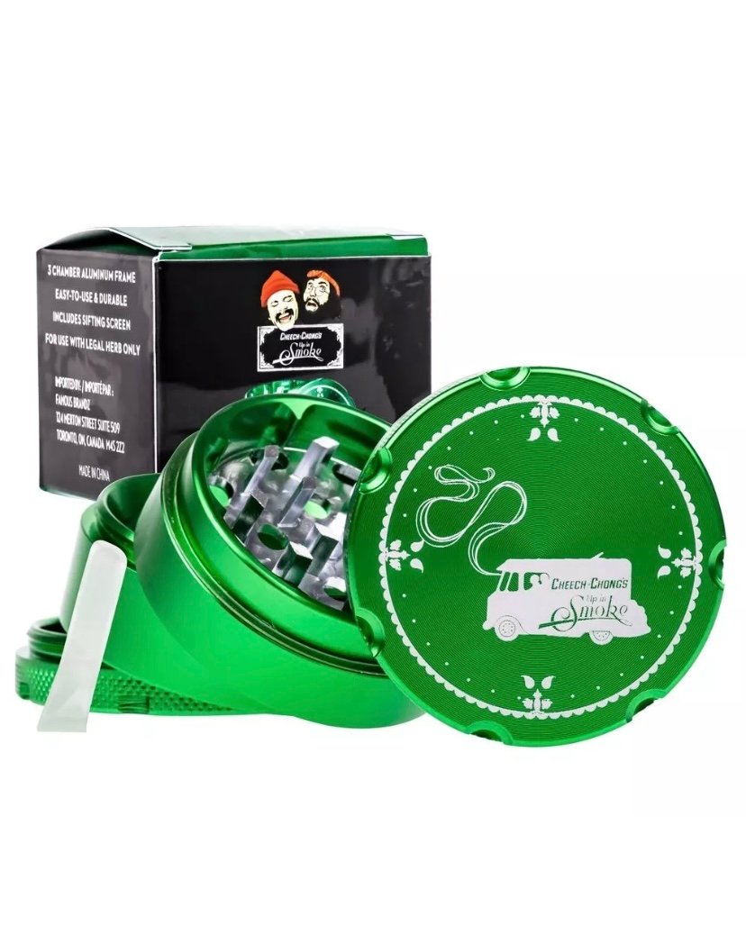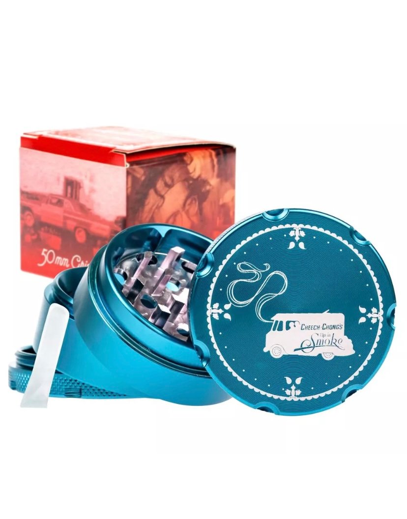 This solid Cheech & Chong 4-part grinder is made entirely out of CNC (computer numeric controlled) aluminum and measures 5 cm / 2 inches across. The pocket size grinder is equipped with sharp, diamond-shaped teeth that effortlessly shred your favorite dry herbs into a fluffy, more manageable consistency.