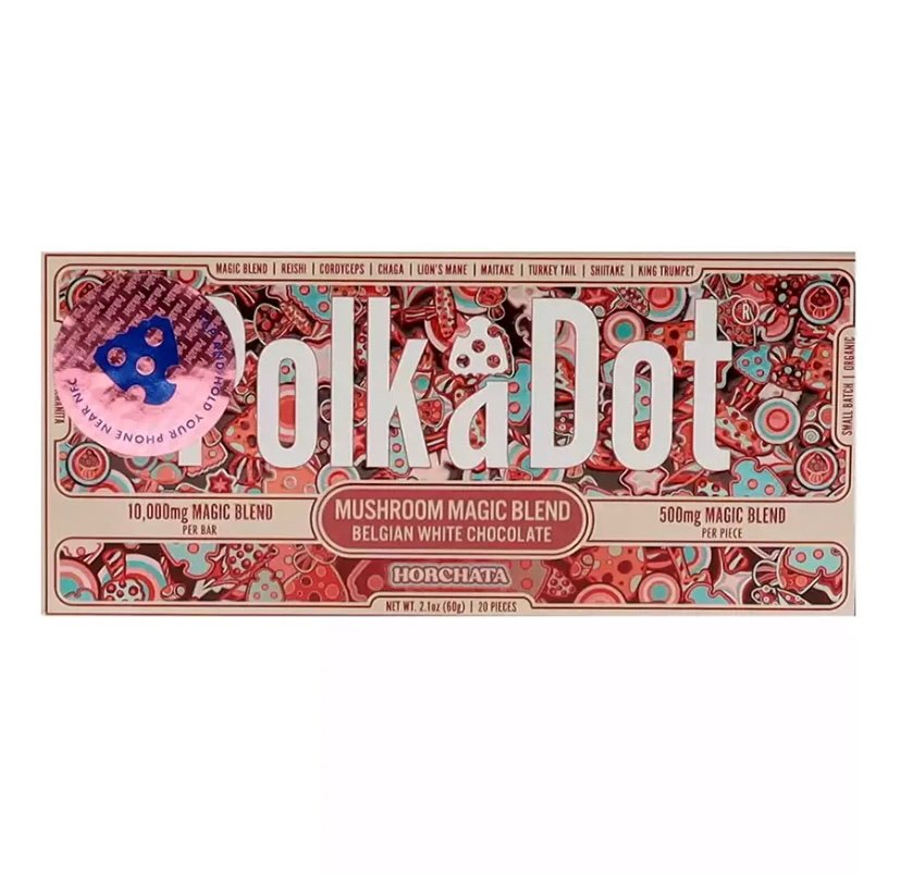 Flavorful Symphony: Horchata PolkaDot Magic Mushroom Belgian White Chocolate creates a harmonious blend of creamy white chocolate and the exotic essence of Horchata. Each bite unfolds a symphony of flavors that transports you to sun-soaked terraces and lively gatherings.