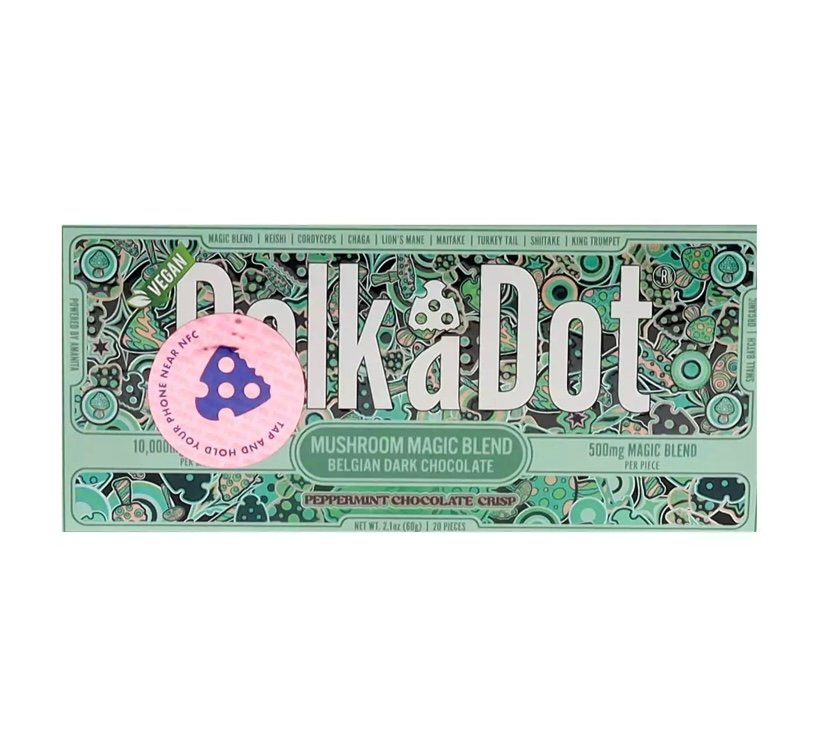 Immerse yourself in the refreshing and mystical fusion of Peppermint Chocolate Crisp PolkaDot Magic Mushroom Belgian Dark Chocolate.
